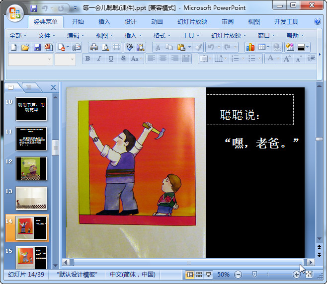 有一天,聪聪看见爸爸正在往墙上钉一颗钉子,就说:“嘿,老爸。”