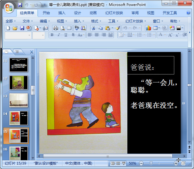 爸爸虽然感觉到了疼,但聪聪的爸爸说:“等一会儿,聪聪。爸爸现在没有空。”