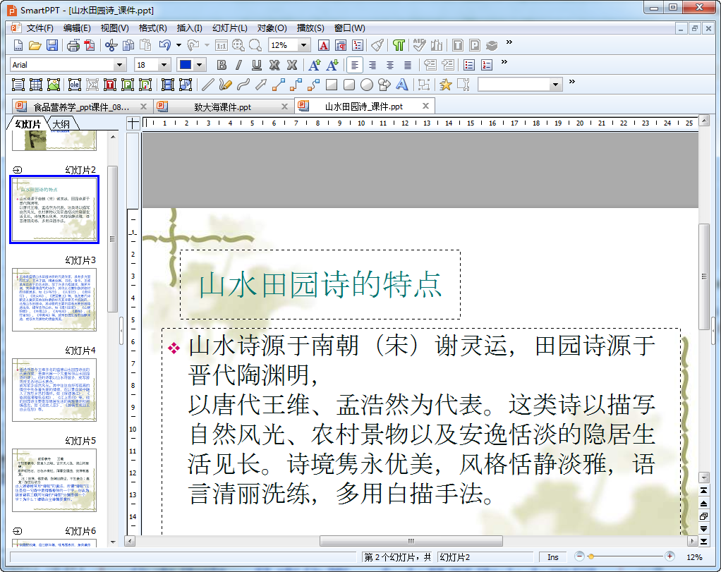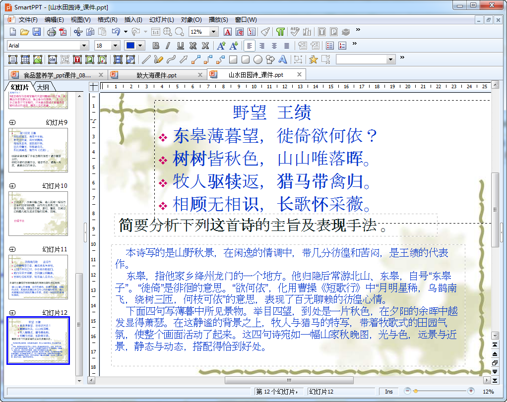 这篇是一篇讲述山水田园系列诗歌的ppt,描述了田园诗的起源与发展,列举了许多诗人的代表作,而且还陈述出了鉴赏中常用到的术语比较实用,该ppt有12页,有兴趣的朋友可以来下载这款山水田园诗ppt!