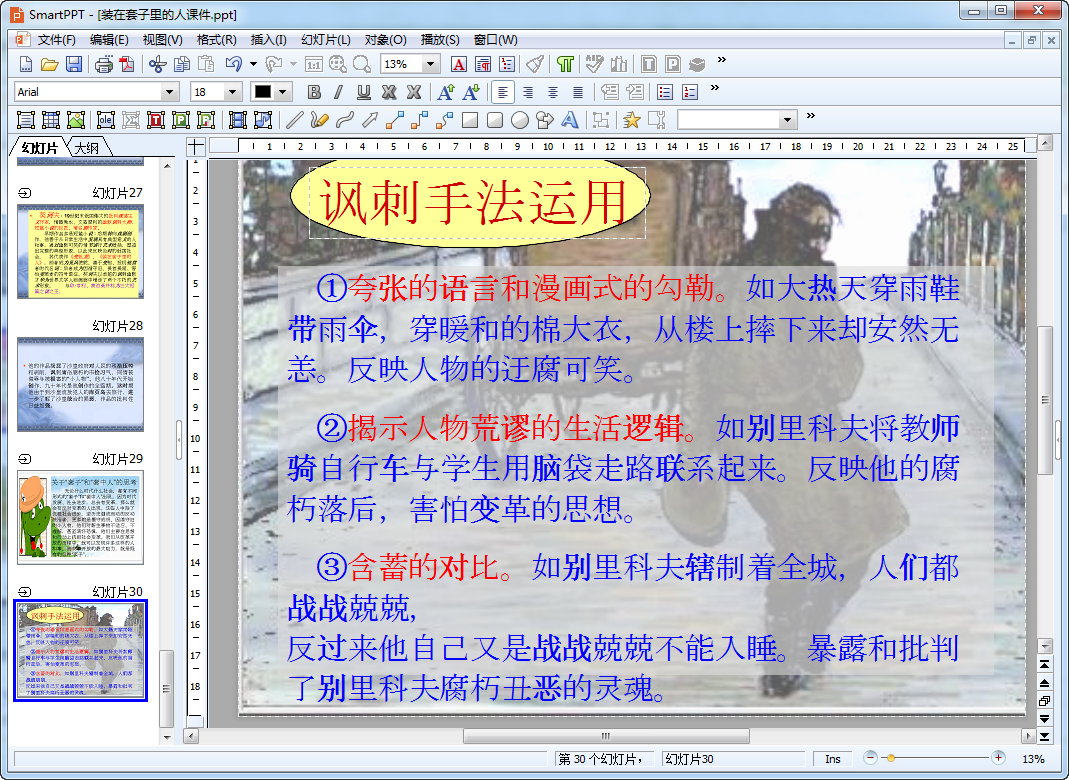 这份以ppt形式展现的装在套子里的人教学课件共30页,内容包括作者介绍,课文导读,课文重难点语句分析等,适合作为教学课件使用,如果你需要这份装在套子里的人ppt的话,那就赶紧来东坡下载吧!