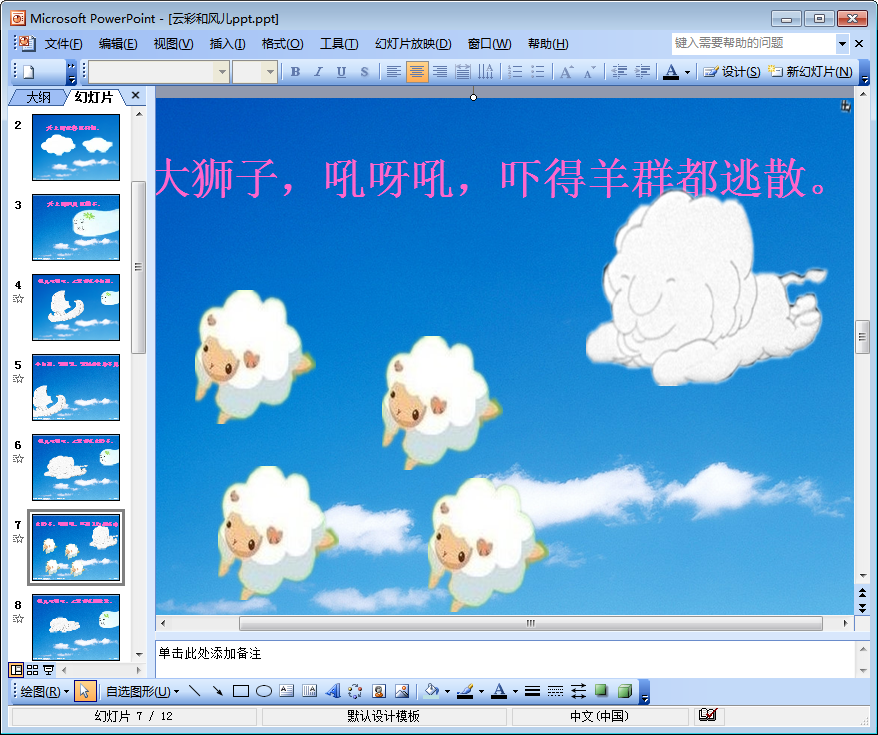 吹呀吹,云彩变成大狮子,躬起身子,张开大口,狮子吼呀吼,吓得羊群都逃散。