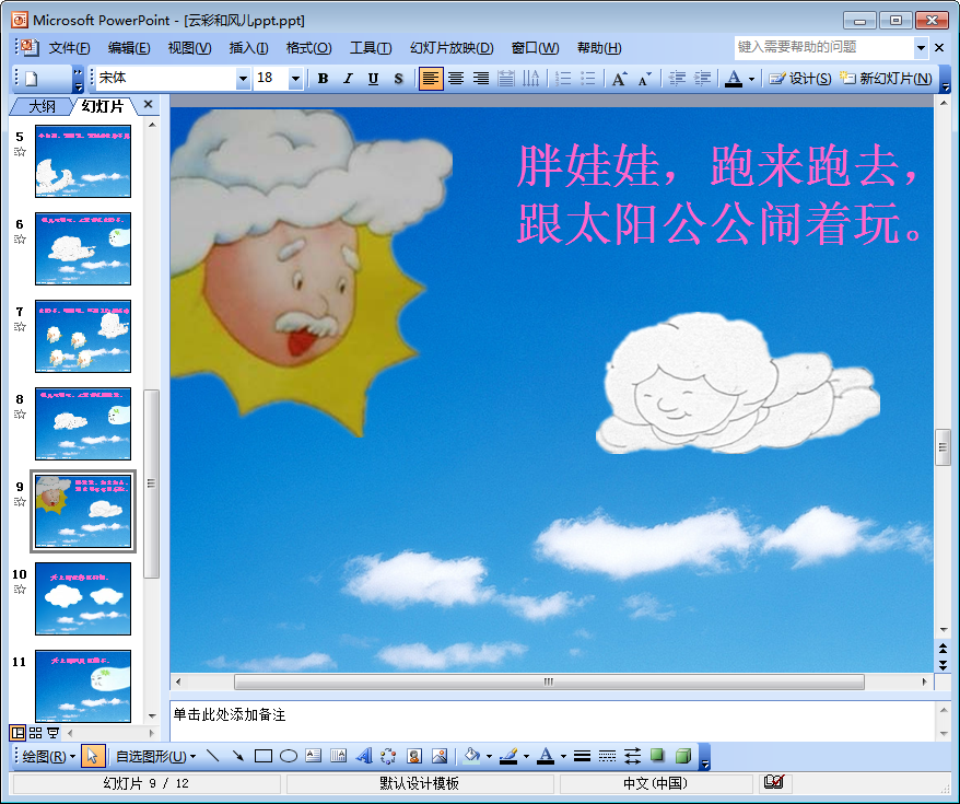 吹呀吹,云彩变成胖娃娃,头戴帽子,身穿围兜儿,跑来跑去,跟着太阳公公闹着玩。