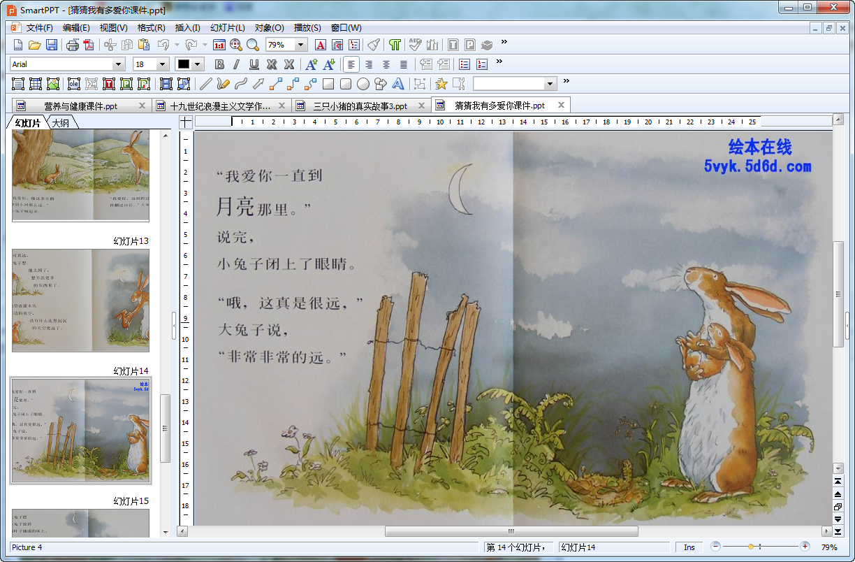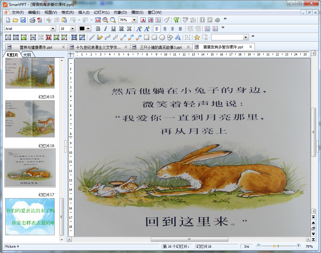 这是一片猜猜我有多爱你绘本,讲述了兔爸爸在故事中对对小兔子们的各种爱与呵护,该ppt是全套的完成版共17页,可以当作孩子们的对父爱的启蒙读物,有兴趣的老师家长们可以来下载!