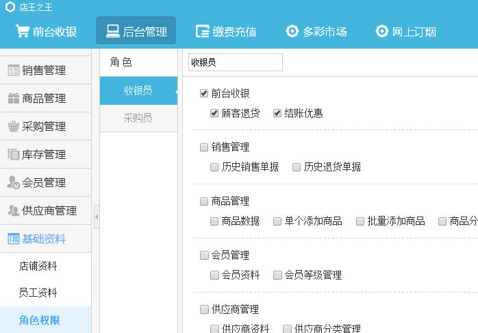 多个员工,多种角色,灵活权限支持店长根据具体情况设置。
