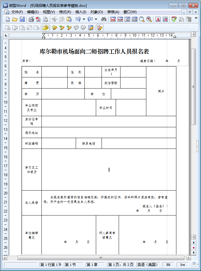 相信不少朋友对于机场招聘人员报名表长什么样还是比较好奇的吧?如果你的回答是“的确如此”的话,那么不妨来看看这份doc格式word版库尔勒市机场面向二师招聘工作人员报名表——是的,机场招聘人员报名表其实和机场应聘简历可以通用呢!如果你需要这份招聘人员报名表的话,那就快来东坡下载吧!