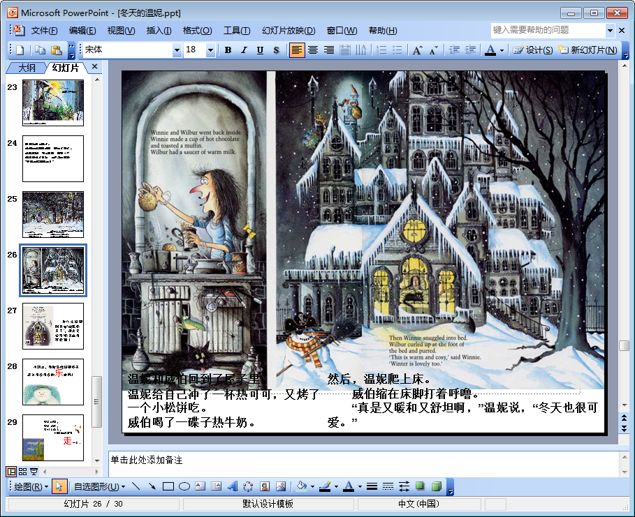 这是一份内容完整且免费的、共由30页组成的冬天的温妮ppt——这份ppt内容不仅包括对冬天的温妮这本绘本的课前导读还有与该绘本相对应的作业哦!是一份十分适合作为教案课件使用的ppt,如果你需要这份冬天的温妮教案ppt的话,那就快来东坡下载吧!