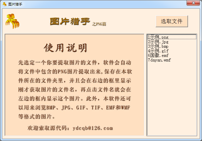 明星图片猎手绿色免安装,解压后就能运行,去除示例文件后软件本身只有64K大小,使用方法也很简单,先选取一个你要提取图片的文件,明星图片猎手会自动将文件中包含的PNG图片提取出来,保存在本软件所在的文件夹里,并且会在右边的框里显示刚才获取图片的文件名,再点击文件名就会在左边的框内显示这个图片。此外,本软件还可以用来浏览BMP、JPG、GIF、TIF、EMF和WMF等格式的图片。