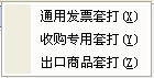 包括如下内容:1、通用发票套打;2、收购专用套打‘3、出口商品套打。如下图。