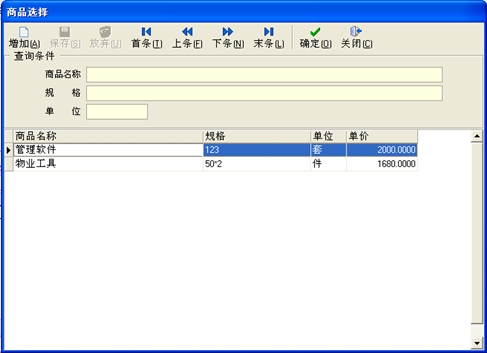 点菜单中“增加商品”来增加一条新的商品记录,然后在该记录的品名规格栏,点右边的“…”铵扭选择商品。如下图。选中一条已存在的商品记录,点鼠标右键,点菜单中“删除商品”,可以删除当前选中的商品记录。