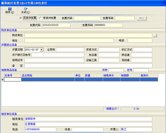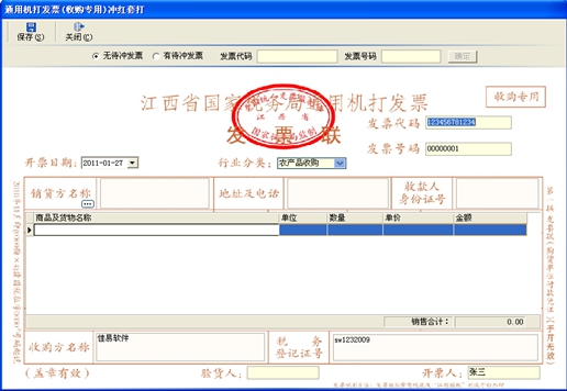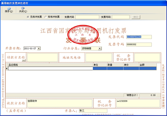 分“无待冲发票”和“有待冲发票”两种情况。首先确定被冲红的发票是否是系统中开具的,如果是,则选中“有待冲发票”,填写好被冲红的发票的发票代码和发票号码,点“确定”铵扭,得到被冲红发票的信息,但商品的数量和金额自动改为负数。然后选择当前的开票日期,点“打票”按钮完成冲红发票的套打。如果被冲红发票不是系统中开具的,则选中“无待冲发票”,并填写好被冲红发票的发票代码和发票号码。接下来的操作和前面的“通用发票套打”的操作是一样的,但要求商品的数量为负数。最后点“保存”按钮完成冲红发票的保存和套打。