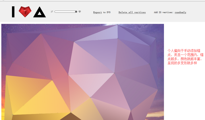 triangulator其实就是一款很好用的多边形图片制作工具。可以让大家在1步内轻松画出高大上多边形几何背景图,这款可以在本地用浏览器打开,因为只有不少100kb的大小,对于需要又怕麻烦的小伙伴来说,真是不可多得好工具!