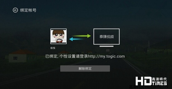 在网络机顶盒上打开泰捷视频软件,执行操作“个人中心”——“账号绑定”,将下列提示的网址输入到电脑浏览器上;