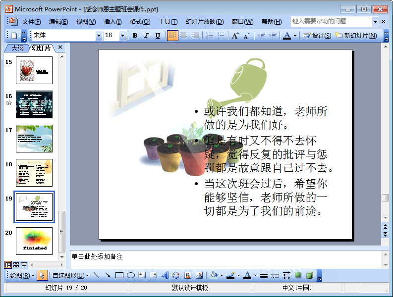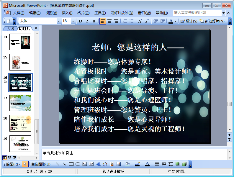 这是一份名为感念师恩的ppt(类似的ppt本站还有感恩教师节主题班会ppt、 感恩班主任主题班会ppt课件等),该ppt共由20页组成,适合作为感恩或是教师节的主题班会课件进行使用(以下简称为感念师恩ppt),下文是该感念师恩ppt的相关内容摘选及预览图,欢迎有需要的朋友们前来下载使用!