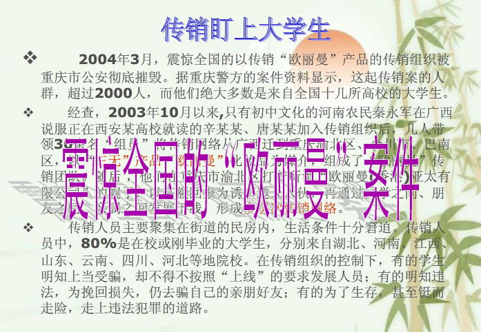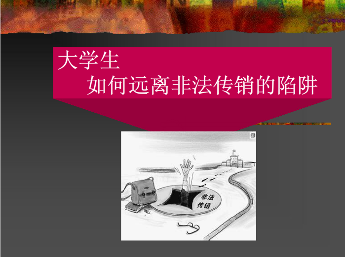 传销是什么相信大家都是明白的,还有传销的危害有多严重相信也是大家清楚的,那么为什么现在还是有很多的人都是被传销欺骗了?请看看下面的这些不错的反传销ppt吧!