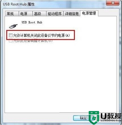 7、若重新插入还是没好,则右键点击“通用串行总线控制器”下的“USB Root Hub”项目,点击“属性”。在打开的也窗口中点击“电源管理”选项卡,去掉“允许计算机关闭此设备以节约电源”,点击“确定”按钮(依次对每个USB Root Hub的属性进行修改)。