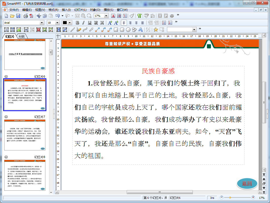 1.我曾经那么自豪,属于我们的领土终于回归了,我们可以自由地踏上属于自己的土地。我曾经那么自豪,我们自己的宇航员成功上天了,哪个国家还敢在我们面前耀武扬威。我曾经那么自豪,我们成功举办了有史以来最豪华的运动会,谁还敢说我们是东亚病夫。如今,“天宫”飞天了,我还是那么“自豪”。自豪自己的民族,自豪我们伟大的祖国。