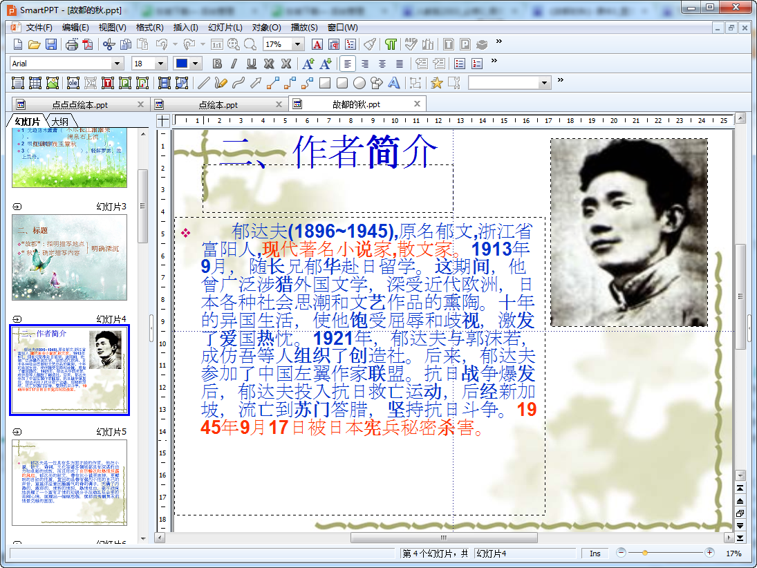 这是郁达夫的作品故都的秋教学教案共有19页,ppt中对作者的简介以及当时创作是的悲凉气氛表现的淋漓尽致,需要这样一份ppt的同学以及老师们可以来下载!