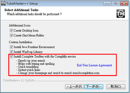 下载并执行安装程式,安装的过程TubeMaster++ 会自动侦测是否有安装WinPcap 及Jave Runtime,如果没有安装过,安装程式会自动帮你安装,由于TubeMaster++ 是用JAVA 开发及必须依靠WinPcap 这套封包撷取软体,直接分析正在开启的网路影片或音乐,所以2者都必须安装,另外,安装过程中预设会更改浏览器的预设首页及搜寻引擎,若不需要请勿勾选。