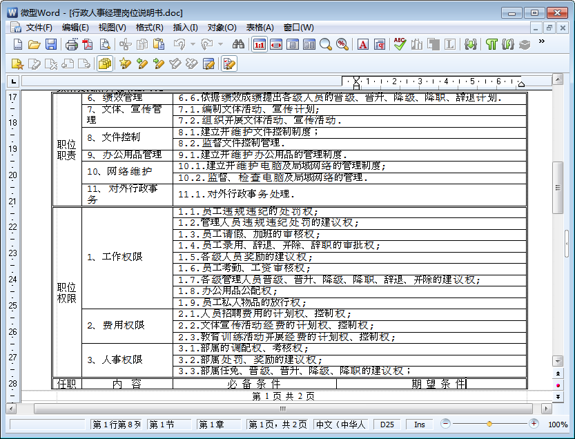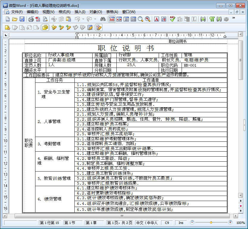 行政人事经理岗位说明书内容截图