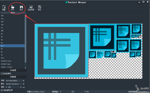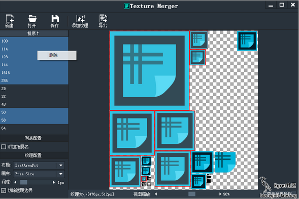 导入素材后我们便可以看到布局好的大纹理啦,工具对导入的纹理做了去重处理,相同的纹理不会重复显示,只保留纹理名称。左侧有对应的纹理列表,这些名称是跟文件名一致的,通过列表我们可以看到对应的纹理框在大图上的位置,也可以Ctrl或者Shift键多选后Delete删除无用纹理,右键删除选项也可以完成操作。