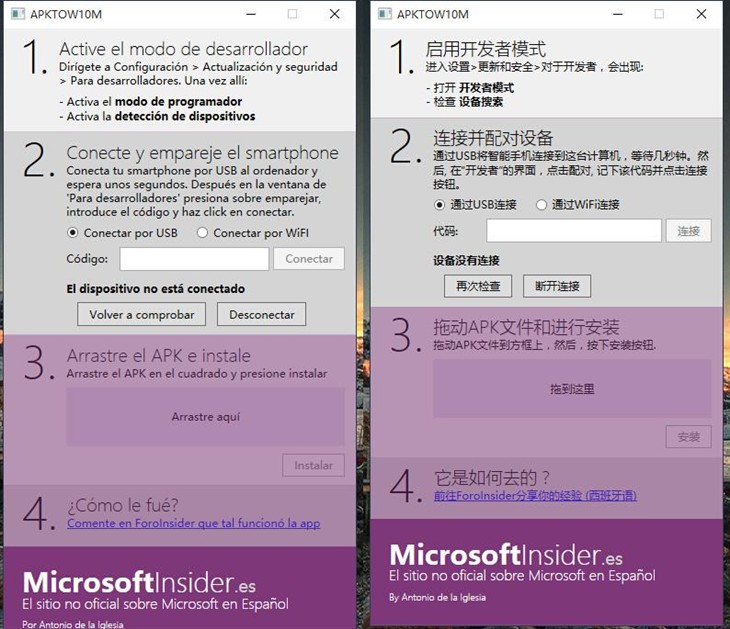 APKToWin10M确实简单了不少,不过西班牙版本的文字却真的是难以理解,好在有中文补丁,经测试该软件通过用数据线连接更为稳定。