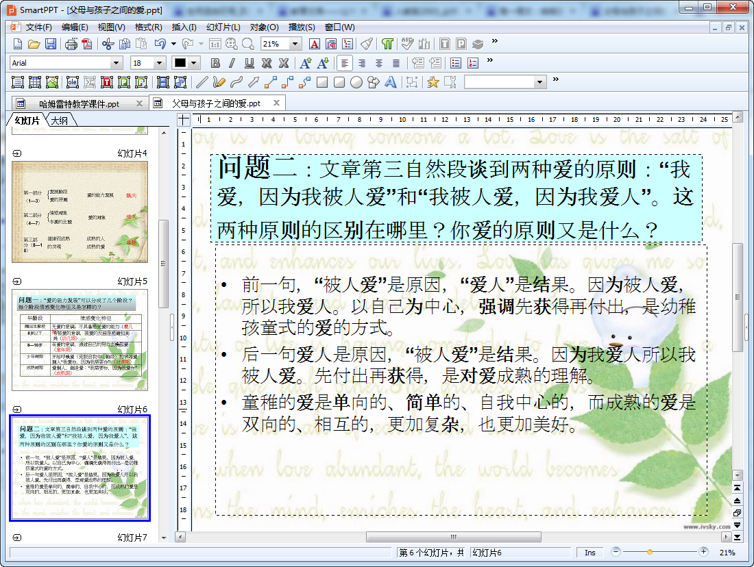 问题二:文章第三自然段谈到两种爱的原则:“我爱,因为我被人爱”和“我被人爱,因为我爱人”。这两种原则的区别在哪里?你爱的原则又是什么?