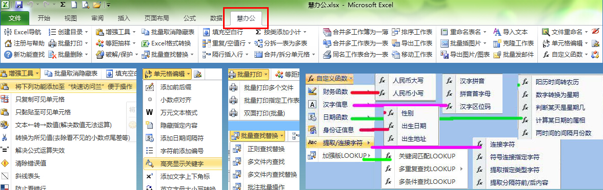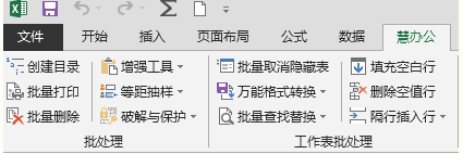 1、安装《慧办公》软件后,打开Excel,《慧办公》软件将出现在Excel的功能区,如下图:
