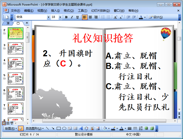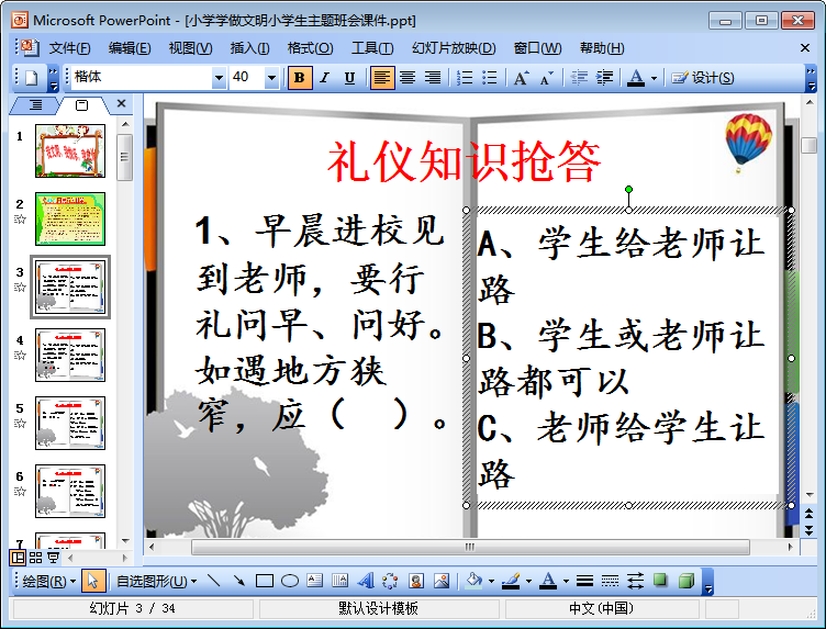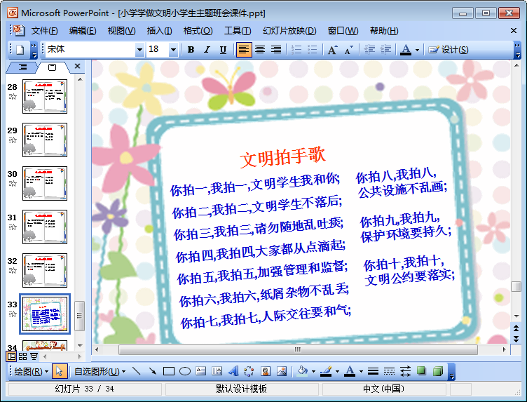 这份内容免费的、共由34页组成的学做文明小学生主题班会课件ppt主要围绕我文明、我快乐、我成长展开进行,内容包括小学生日常行为规范考察、文明拍手歌学习等,如果你需要一份学做文明小学生ppt或是文明主题班会ppt,那么不妨参考一下这份ppt课件吧!