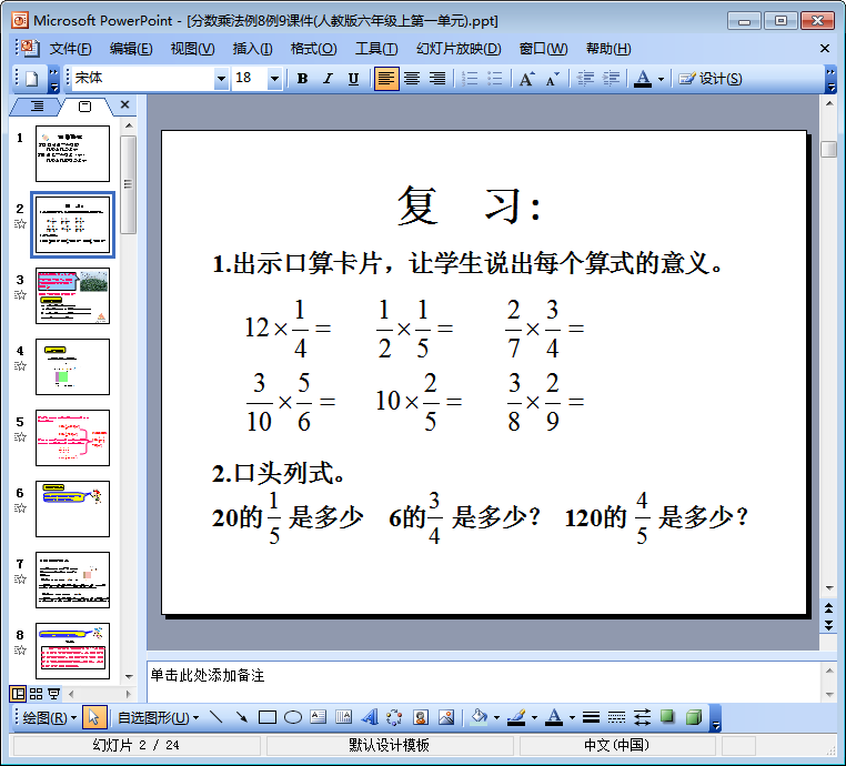 最近看到有朋友在找关于人教版六年级上第一单元分数乘法例8例9的课件,于是东坡小编便赶紧为他整理带来了这份最新整理版共由24页组成的分数乘法例8例9ppt课件,如果你也需要这份关于“例8 连续求一个数的几分之几是多少”、“例9 求比一个数多(少)几分之几的数是多少”的课件,那么就赶紧来东坡下载吧!