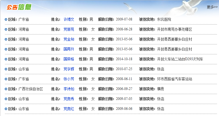 全国打拐解救儿童寻亲公告平台部分公告信息