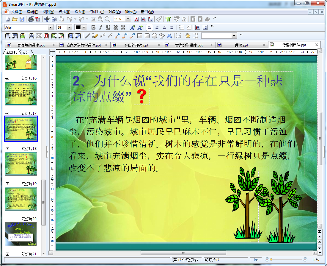 这是一篇行道树教学课件ppt,我们提供免费的下载,该ppt共23页完整的讲述了这篇课文中的各种重难点,比较全面的一部ppt,需要这篇课文课件的老师们可以来这部下载看看,绝对值得你需要!