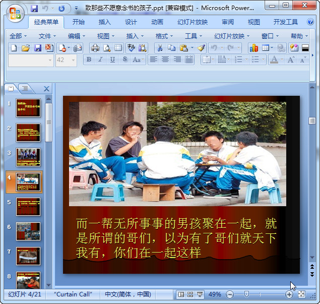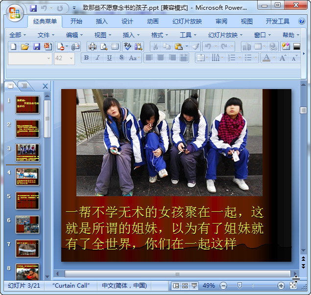 可是,你们不好好上学,你们以为这就是疯狂,这就是该有的青春?一帮不学无术的女孩聚在一起,这就是所谓的姐妹,以为有了姐妹就有了全世界,你们在一起这样而一帮无所事事的男孩聚在一起,就是所谓的哥们,以为有了哥们就天下我有,你们在一起这样 你们骂那些好学生,骂他们是书呆子,骂他们傻、只知道读书,殊不知,