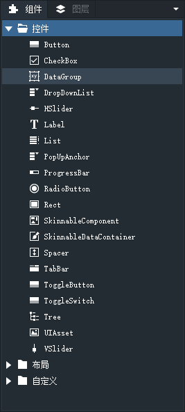 组件面板包含当前项目中所有可以使用的组件列表,其种类为“控件”,“布局”,“自定义”。您可以通过拖拽的方式把在文档区的设计视图中创建组件。