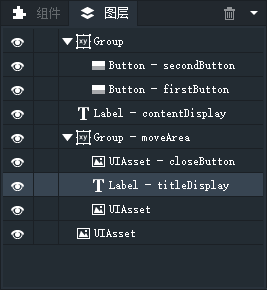 该面板展示出当前文档区正在编辑的Exml皮肤文件中所有组件的层级结构。您可以通过该面板快速选中在文档区中与之对应的组件。 您也可以通过该面板更直观的调节文档区中组件之间的层级结构。
