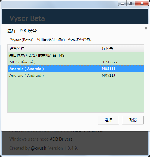 Vysor的设置非常简单,只需要在Chrome里安装Vysor,打开Android设备的 USB 调试模式,用USB线连接电脑与Android设备,就可以控制了。