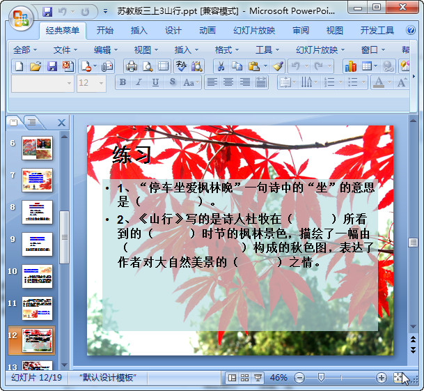 三年级山行ppt苏教版,是一款可以当做公开课来讲述的ppt课件。十分的精彩,适用,把孩子们带入秋天的山里,体会自然的无限风光魅力。欢迎有兴趣的伙伴前来东坡下载使用!
