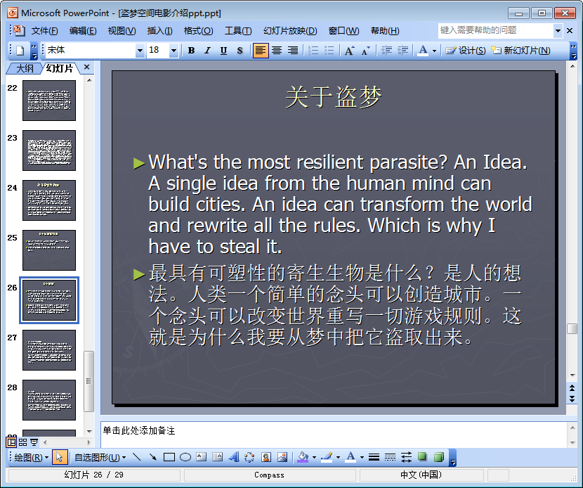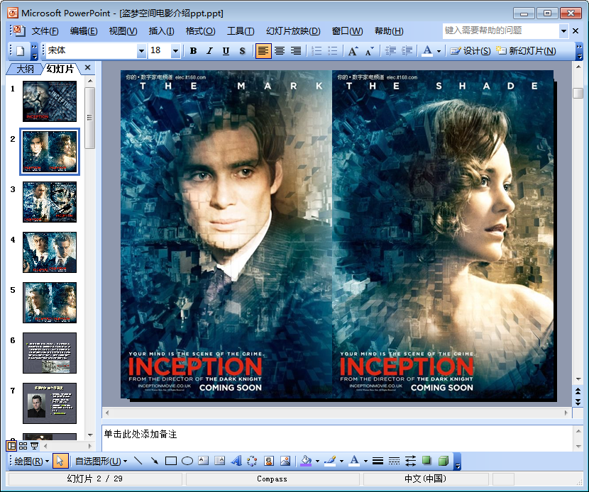 有朋友表示在本站的经典电影介绍ppt中并没有看到关于盗梦空间的ppt介绍——他觉得这对盗梦空间这部电影不公平,毕竟人家也是在豆瓣电影250之列——小编必须承认那时是马虎了点,没有加盗梦空间电影介绍ppt,希望此时加上为时不晚,欢迎有需要的朋友们前来下载哦!