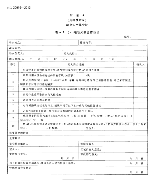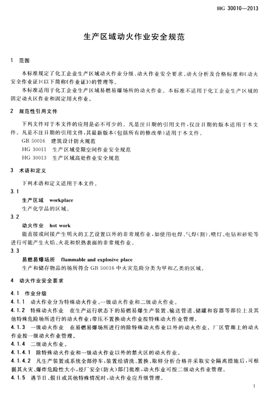 HG 30010-2013生产区域动火作业安全规范于2013年12月31日发布,于2014年7月1日生效,该规范一般被简称为hg300102013或是生产区域动火作业安全规范2013。本节内容东坡小编为大家整理带来的是一份pdf格式高清电子版生产区域动火作业安全规范2013,共有需要的朋友们下载下来作为学习参考资料使用!