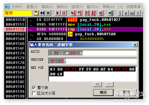 * 如果搜不到,请确保你在 OEP 附近,并勾上搜索整个块。