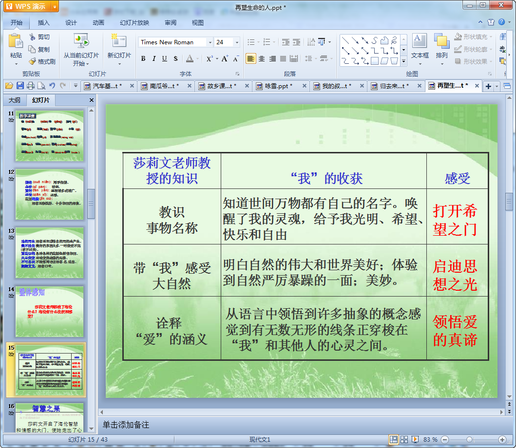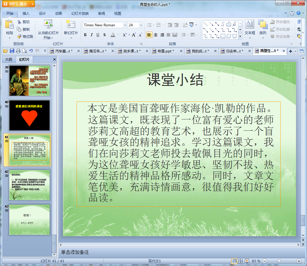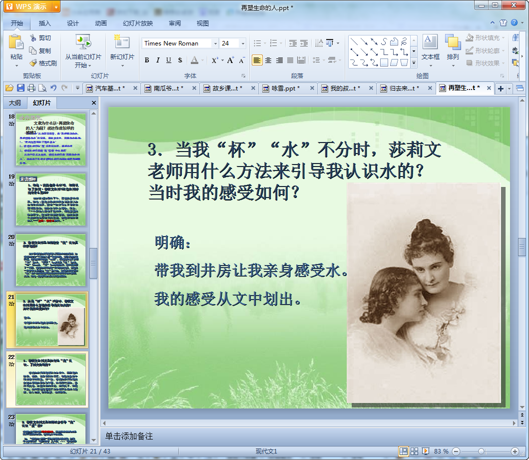 这是语文课文再塑生命的人的教学课件,该ppt共有43页,讲述了作者海伦对莎利文老师的无比敬爱和感激之情,并且课件中对课文的重难点都在做出了解析,正在寻找这篇课文的课件的老师们可以来看看!