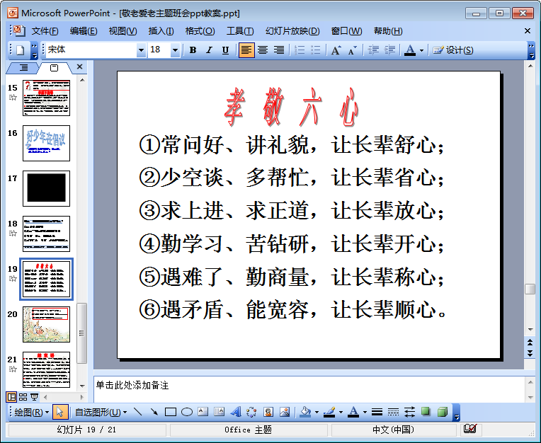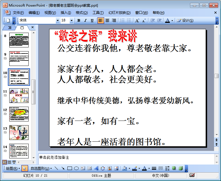 “让童年闪光,让夕阳更美”——本节内容东坡小编为大家整理带来的是一份内容完全免费的、共由21页组成的敬老爱老主题班会ppt教案(以下简称为敬老爱老ppt),如果你需要一份下载下来可直接进行使用的敬老爱老主题班会教案的话,那么不妨参考一下这份敬老爱老ppt吧!