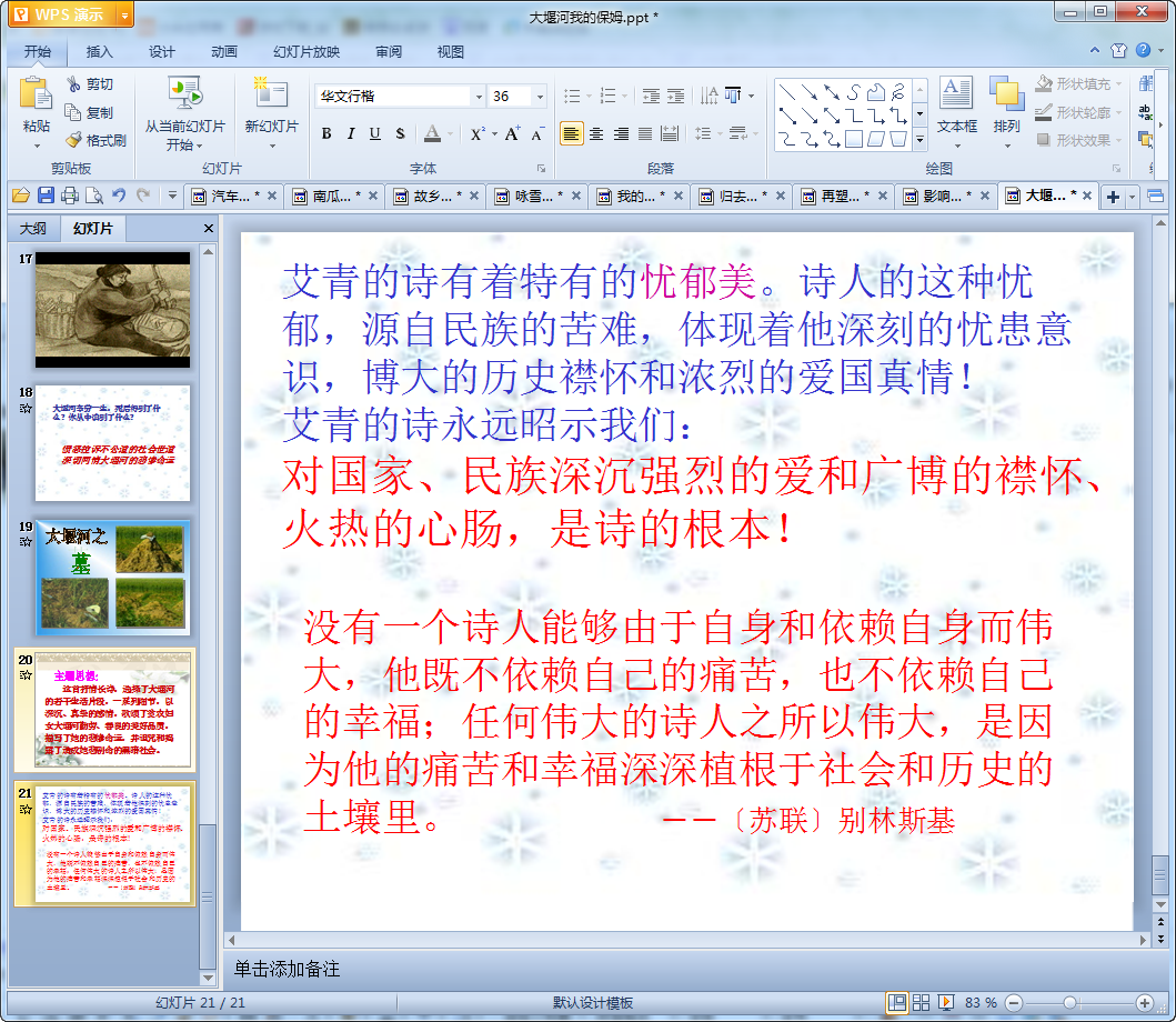 这是一篇语文课中需要的大堰河我的保姆ppt课件,该ppt共有21页制作精美,对诗歌中知识点的分析十分具有条理性,非常不错的一篇优质课件,有需要的老师们可以来下载!