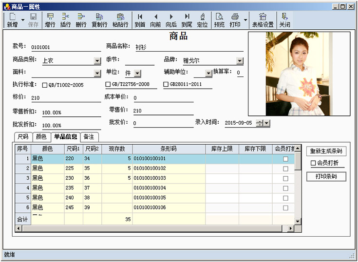 款号提供尺码、颜色管理,提供尺码组、颜色组管理,提供零售价、批发价以及门店特定价管理,提供款号照片管理。