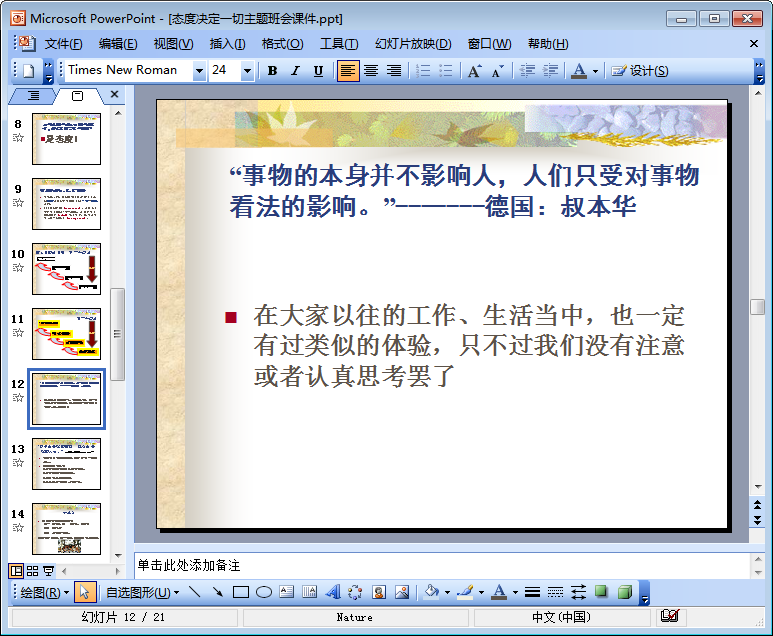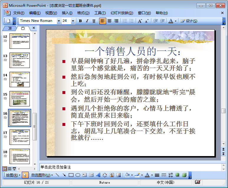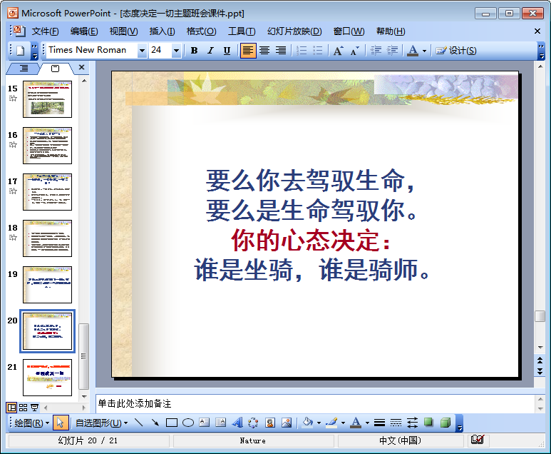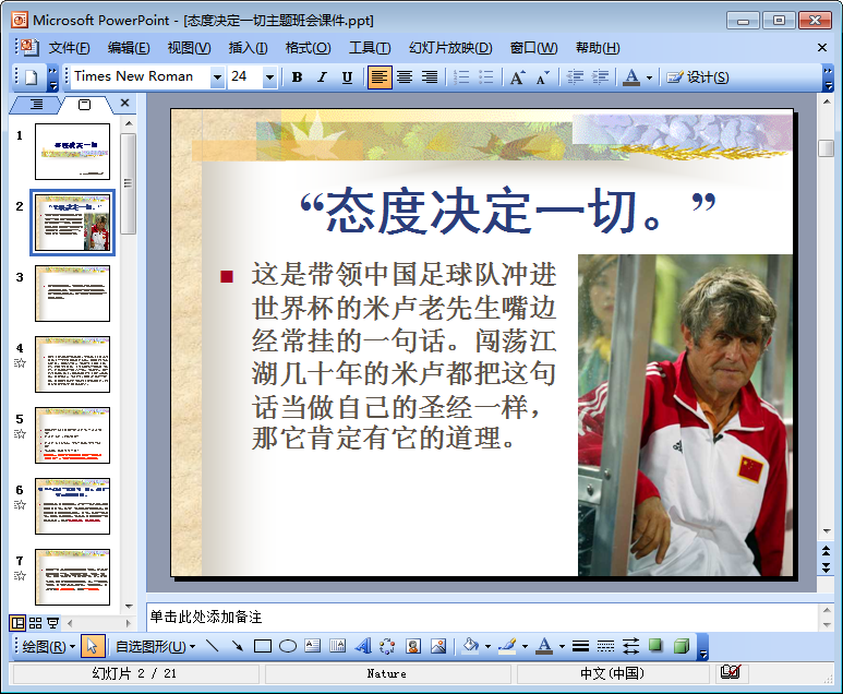 这份主题为“态度决定一切”的课件ppt共由21页组成。ppt内容十分精彩,举例也十分恰当,适合作为班会课件进行选取使用。如果你需要召开一堂主题为“态度决定一切”的班会,那么这份ppt将会对你大有裨益哦!有需要的朋友们快来东坡下载吧!