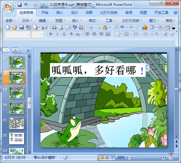 回声ppt课件,一份精美细致的ppt课件。有荷塘、青蛙、小桥流水等景色,让人心驰神往。这么漂亮的画面一定能够吸引小朋友们的注意力,集中听课,让老师讲起课来事半功倍。欢迎前来东坡下载使用!