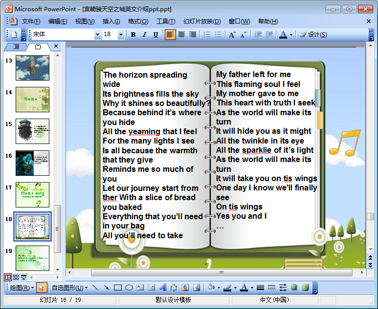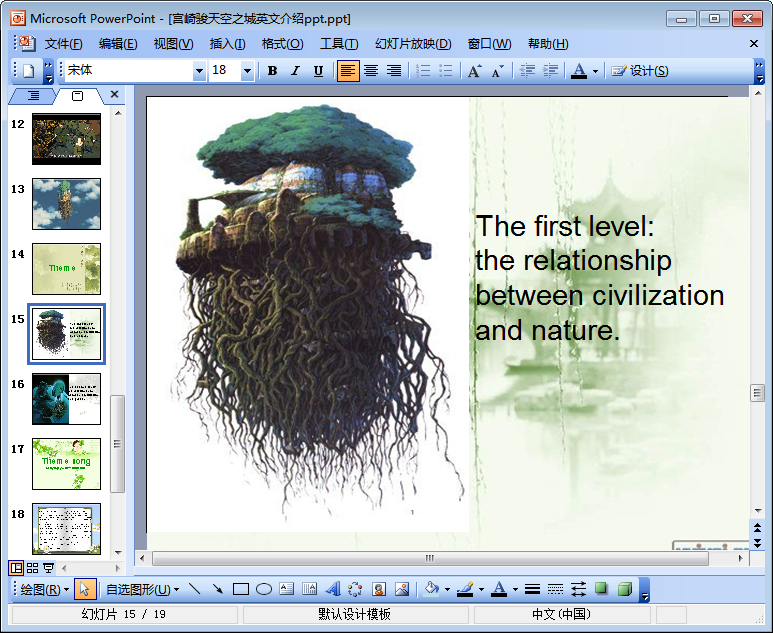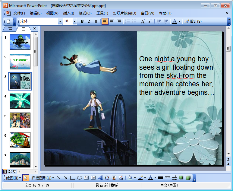 看到有朋友说需要一份关于天空之城的英文介绍ppt,于是东坡小编便为大家精选整理带来了这样一份内容完全免费的、共由19页组成的宫崎骏天空之城英文介绍ppt,希望能对大家有所帮助!需要下载得朋友们只需轻轻点击本文相应的下载地址进行下载即可哦!