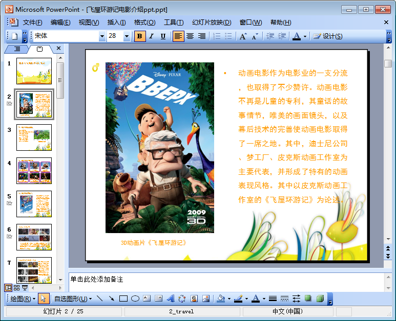 这份介绍飞屋环游记电影的ppt内容包括对飞屋环游记影片的基本信息介绍、影片的主角介绍、影片的故事情节介绍,另外ppt还对主人公得个性进行了详细分析,在这其中还包括有故事的转折、故事的高潮、故事的结尾介绍等,是一份超赞的介绍飞屋环游记电影的ppt,想要下载得朋友千万别犹豫了!就是它了!