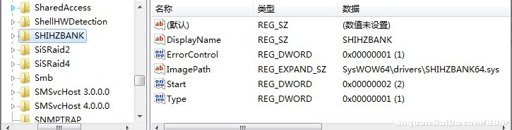 请点击开始-运行,输入regedit打开注册表后定位到HKEY_LOCAL_MACHINE\SYSTEM\CurrentControlSet\Services下,点击编辑-查找,输入shihzbank64.sys,搜索到的键中ImagePath字段就是驱动文件具体目录,如图所示