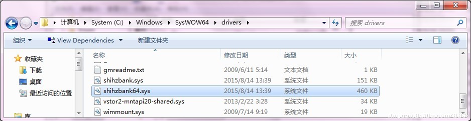 2、删除文件,通过第1步定位到驱动对应的注册表键后,ImagePath字段对应的文件目录为syswow64\drivers\shihzbank64.sys,打开C:\windows\syswow64\drivers删除shihzbank64.sys即可。