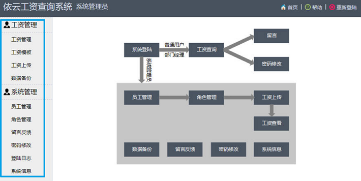 1.设有3种不同的角色,系统管理员,部门管理员与普通用户。系统管理员可以添加各部门管理员、上传工资表等,部门管理员可编辑对应部门的员工与工资,员工可查看自己工资。